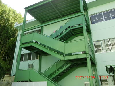 理科室からの発災では日頃使っている階段や昇降口ではなく、校舎東側の非常階段を使います。慣れない経路ですが、ぼうさいたいむの成果もあり、子どもたちは静かに素早く避難することができました。