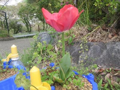 1年生のために、2年生ががんばって育てたチューリップ。なかなか咲かなかったけれど、入学式直前に、小さくもたくましく花が咲いて、入学を心からお祝いしてくれました!!